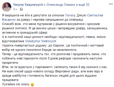 "Я решила не идти в депутаты по списку Голоса. Спасибо Святославу Вакарчуку за доверие и очередное приглашение к сотрудничеству. Спасибо всем, кто меня поддержал в решении выдвигаться и понял решение сняться. Я это высоко ценю и оправдаю доверие, оставаясь активной в общественной сфере", - написала Ярина Ясиневич.