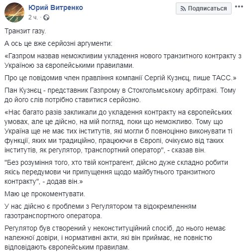 По словам Витренко, договоренность о "свопе" соответствует европейским требованиям и практикам. В то же время вопрос не требует проведения анбандлинга Нафтогаза (то есть разделения компании по сферам добычи и транспортировки газа, т.е. выделения из-под ее подчинения ГТС). Именно непроведение анбандлинга в российском "Газпроме" считают главной причиной того, почему "не могут заключить новое соглашение о транзите на европейских условиях".