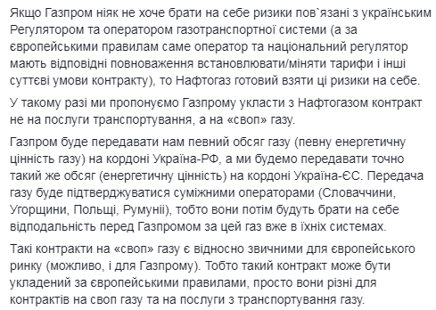 Вместо заключения нового договора о транзите газа из России в ЕС через Украину в "Нафтогазе" предложили поставлять топливо в Европу на условиях "своп". Также предложено соединить газотранспортные системы двух государств. Об этом говорится на фб-странице исполнительного директора "Нафтогаза" Юрия Витренко во вторник, 18 июня.