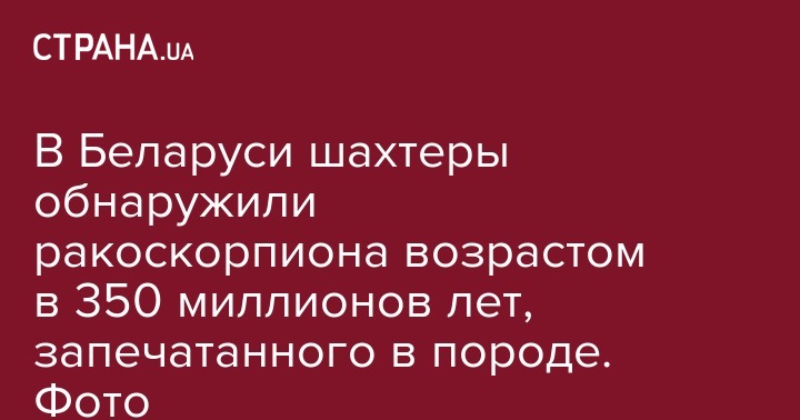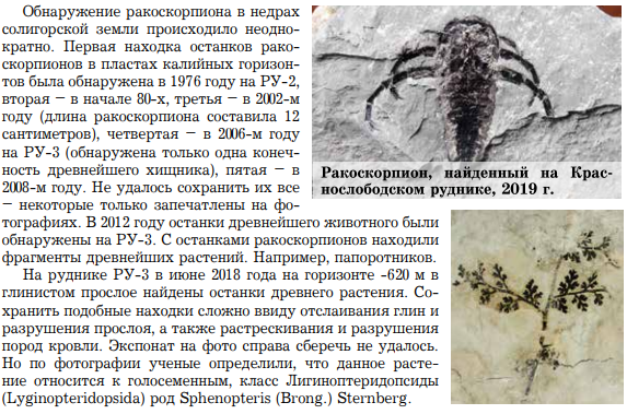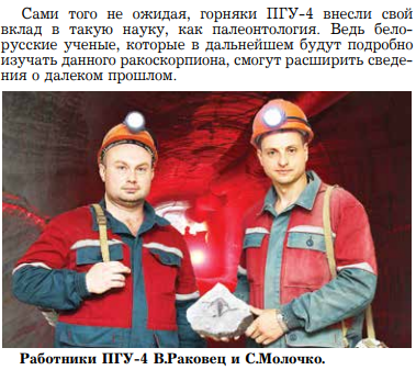Горняки ПГУ-4 обнаружили отпечаток ракоскорпиона в породе времен палеозойской эры на Краснослободском руднике, который входит в производственное объединение "Беларуськалий" (крупнейший мировой производитель калийных минеральных удобрений, расположенный в городе Солигорск).