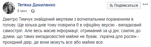 "Дмитрий Тымчук найден мертвым с огнестрельным ранением в голову. Еще несколько дней назад поверила бы в официальную версию - случайный самострел. Но весь массив информации, полученный за эти дни, приводит к мысли, что таких случайностей почти не бывает. Украина для россиян - проходной двор, где они могут все или почти все", - написала журналист Татьяна Даниленко.