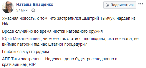 "Ужасная новость, о том, что застрелился Дмитрий Тымчук. нардеп из НФ... Вроде случайно во время чистки наградного оружия