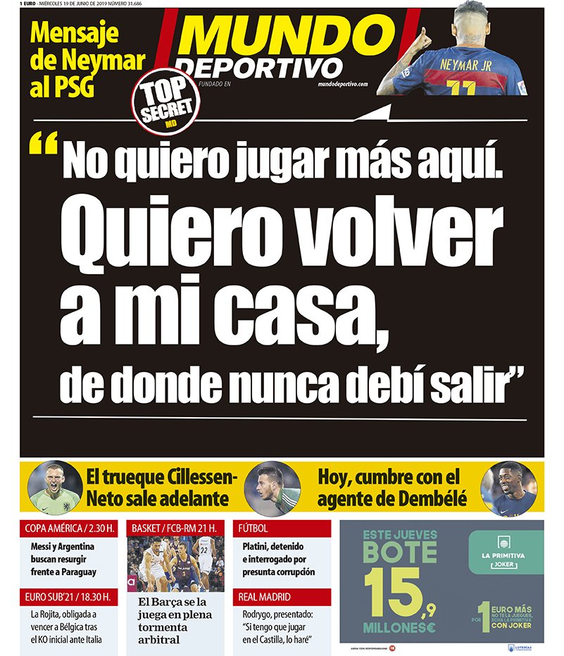 Об этом передает каталонская газета El Mundo Deportivo, которая вынесла цитату Неймара о желании вернуться в Барселону на обложку сегодняшнего номера.