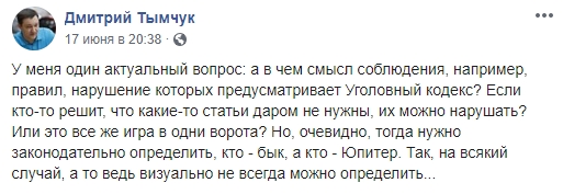 17 июня Тымчук размышлял о преступлениях и наказаниях: "У меня один актуальный вопрос: а в чем смысл соблюдения, например, правил, нарушение которых предусматривает Уголовный кодекс? Если кто-то решит, что какие-то статьи даром не нужны, их можно нарушать? Или это все же игра в одни ворота? Но, очевидно, тогда нужно законодательно определить, кто - бык, а кто - Юпитер. Так, на всякий случай, а то ведь визуально не всегда можно определить..."