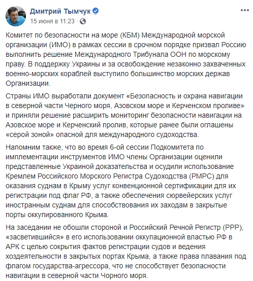 15 июня пост был посвящен инциденту в Керченском проливе, когда Россия захватила украинские корабли. "Комитет по безопасности на море (КБМ) Международной морской организации (ИМО) в рамках сессии в срочном порядке призвал Россию выполнить решение Международного Трибунала ООН по морскому праву. В поддержку Украины и за освобождение незаконно захваченных военно-морских кораблей выступило большинство морских держав Организации", - написал Тымчук.