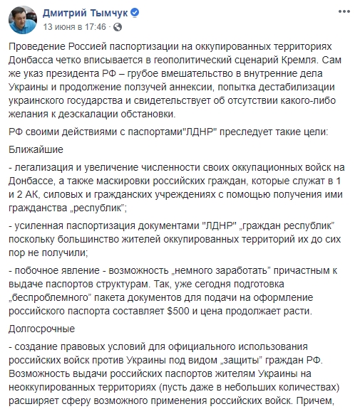 13 июня пост Тымчука был посвящен раздаче российских паспортов на Донбассе.