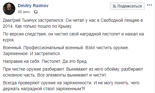 Однако у этой гипотезы уже появилось много противников. Главный аргумент – Тымчук был кадровым военным и не мог чистить заряженное оружие.