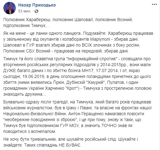 Буквально сразу после трагедии на Тымчука, который много лет работал военным журналистом, был в Ираке и Ливане, и, собственно, на фронтах нашей Национально-освободительной войны, Антон Геращенко пытался повесить "неосторожное обращение с оружием", и это при том, опять же, что Тымчук был подполковником ГУР МОУ, а значит ТОЧНО знал, как вести себя с огнестрелом.