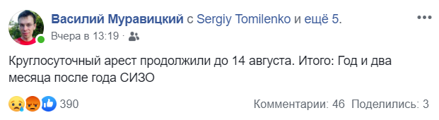 Впрочем, суд отклонил ходатайство обеих сторон. "Суд постановил продлить обвиняемому Муравицкому Василию Александровичу мера пресечения в виде круглосуточного домашнего ареста с запретом круглосуточно оставлять место своего проживания ... Срок действия обязанностей в отношении обвиняемого определить продолжительностью 60 суток до 16 августа 2019 г. включительно", - говорится в тексте постановления суда.