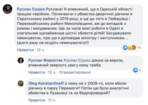 "Я уверен, что в Одесской области работает серийник. Начиная с убийства двухлетней девочки в Саратском районе в 2015 году, а еще до того, в Любашевке и Первомайском районе Николаевщины, аж до случаев с ромом и молдаванином. Еще во время моей работы в Одессе я обобщил минимум шесть убийств детей! Осуждали невиновных, о чем я докладывал министру и заместителям... В этот раз не осудите невиновного!!!"
