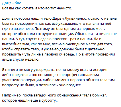 Дом, в котором нашли тело Дарьи Лукьяненко, с самого начала был на подозрении, так как всё указывало, что напали на неё где-то возле него. Поэтому он был одним из первых мест, которое обыскали сотрудники полиции. Обыскали - и ничего не нашли. А тут, спустя неделю поисков - раз и нашли. Да и выгребная яма, как по мне, весьма очевидное место для того, чтобы спрятать тело, и уж её-то должны были тщательно проверить чуть ли не в первую очередь. Но в итоге проверили лишь спустя неделю.