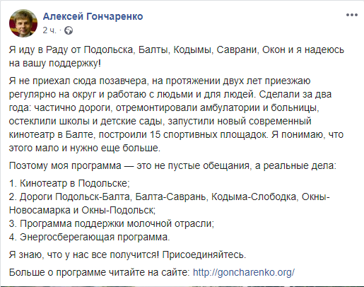 "Я иду в Раду от Подольска, Балты, Кодымы, Саврани, Окон и я надеюсь на вашу поддержку! Я не приехал сюда позавчера, на протяжении двух лет приезжаю регулярно на округ и работаю с людьми и для людей", - написал он на своей странице в соцсети Фейсбук в четверг.