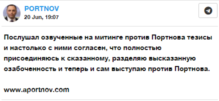 "Послушал озвученные на митинге против Портнова тезисы и настолько с ними согласен, что полностью присоединяюсь к сказанному, разделяю высказанную озабоченность и теперь и сам выступаю против Портнова", - написал он в своем телеграм-канале.