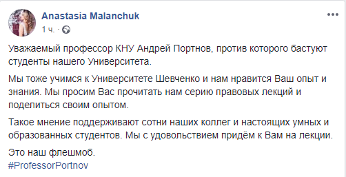 "Уважаемый профессор КНУ Андрей Портнов, против которого бастуют студенты нашего Университета. Мы тоже учимся к Университете Шевченко и нам нравится Ваш опыт и знания. Мы просим Вас прочитать нам серию правовых лекций и поделиться своим опытом. Такое мнение поддерживают сотни наших коллег и настоящих умных и образованных студентов. Мы с удовольствием придём к Вам на лекции", - пишет студентка КНУ Анастасия Маланчук.