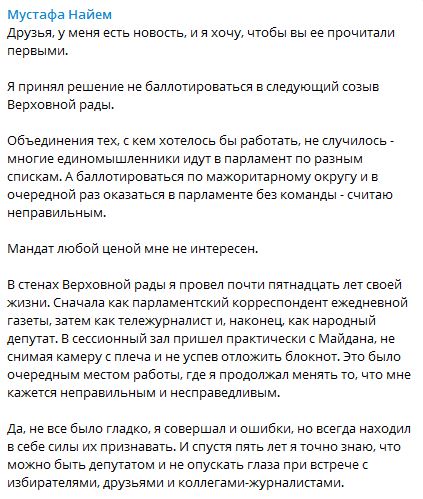 Народный депутат Мустафа Найем решил не участвовать во внеочередных выборах в Верховную Раду. Об этом сам нардеп сообщил в своем Telegram.