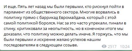 "Я принял решение не баллотироваться в следующий созыв Верховной Рады. Объединения тех, с кем хотелось бы работать, не случилось - многие единомышленники идут в парламент по разным спискам. А баллотироваться по мажоритарному округу и в очередной раз оказаться в парламенте без команды - считаю неправильным. Мандат любой ценой мне не интересен", - объяснил он.