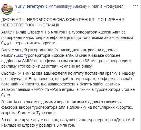 Антимонопольный комитет оштрафовал туроператора Join up на 1,5 млн грн за ложное сообщение о перевозке пассажиров авиакомпаниями МАУ и Роза ветров. Об этом сообщил председатель АМКУ Юрий Терентьев на странице в Facebook.