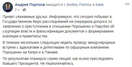 "Привет, уважаемые друзья. Информирую, что сегодня (21 июня) побывал в Государственном бюро расследований на очередном допросе по заявлению о преступлении в отношении Порошенко и Парубия об узурпации власти и фальсификации документов о формировании коалиции и правительства.