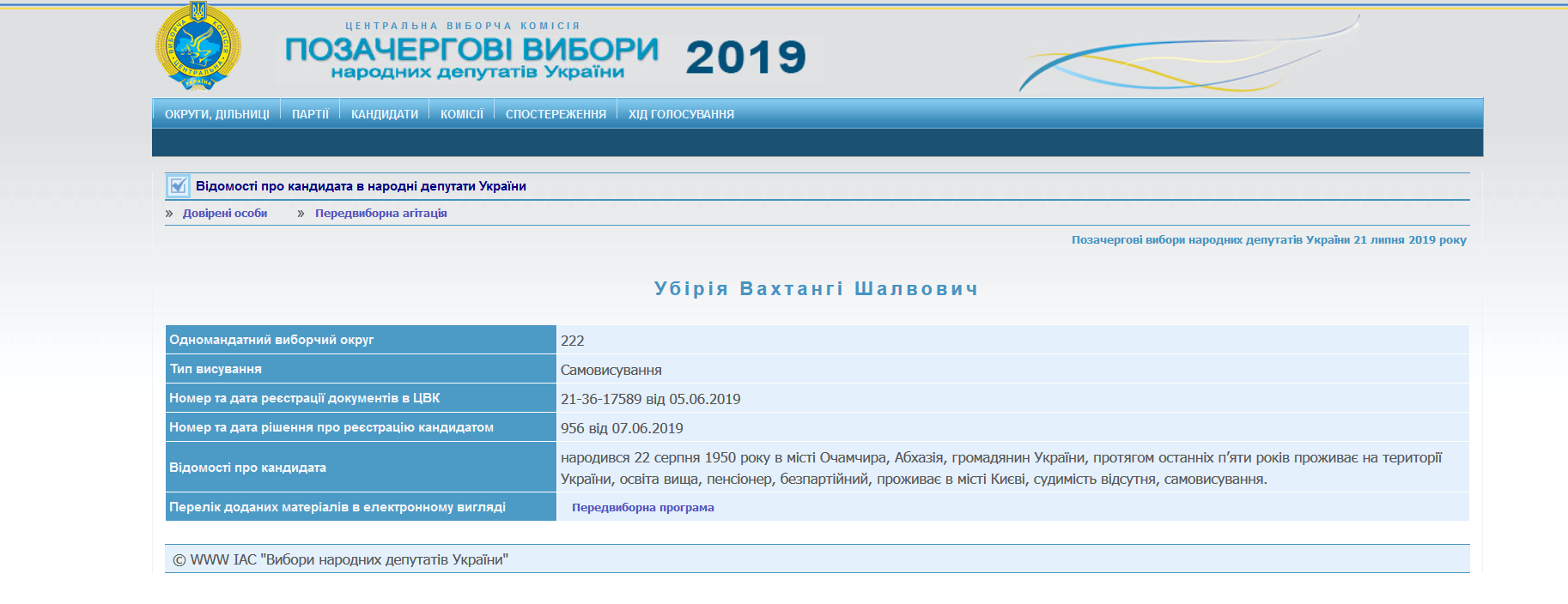 В частности, в данных указано: "родился 22 августа 1950 года в городе Очамчира, Абхазия, гражданин Украины, в течение последних пяти лет проживает на территории Украины, образование высшее, пенсионер, беспартийный, проживает в Киеве, судимость отсутствует, самовыдвижение".