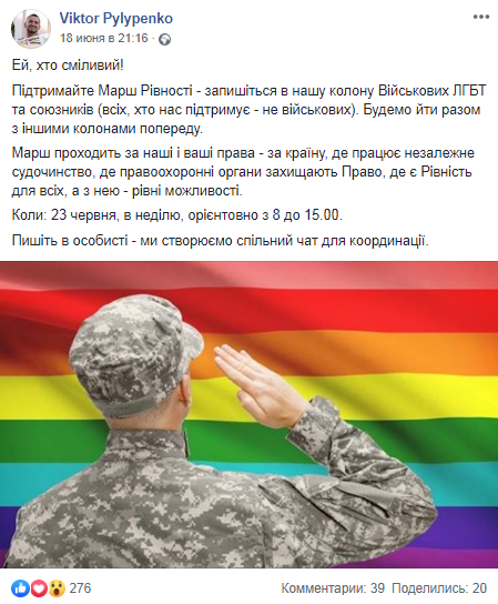 "...Я создал группу в Facebook "Военные ЛГБТ и наши союзники", где собрал всех неравнодушных ЛГБТ-ветеранов и наших союзников для того, чтобы о том, что ЛГБТ-люди воюют за конституционные права граждан Украины, знало как можно больше людей", - сказал Пилипенко.