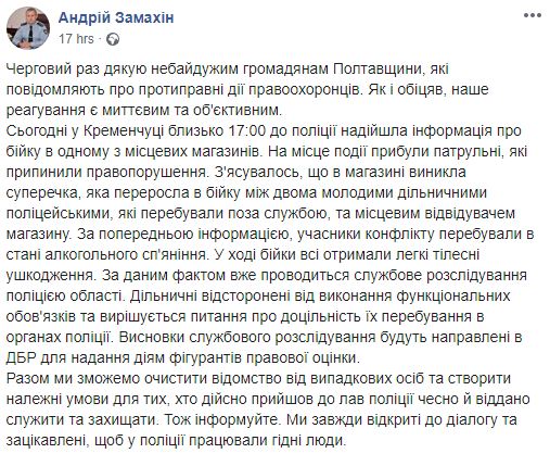 В субботу, 22 июня, в Кременчуге Полтавской области группа пьяных полицейских избила мужчину в магазине. Пострадавший рассказал, что сделал замечание полицейским из-за того, что они кричали и нецензурно выражались в магазине. В ответ между ними завязалась драка.