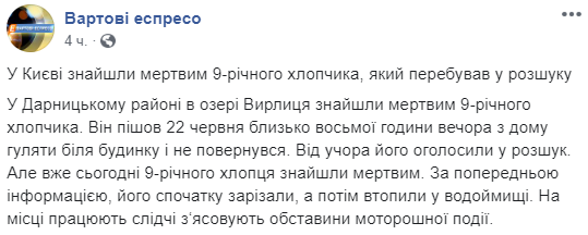 Мальчик вчера около восьми часов вечера пошел гулять возле дома, но так и не вернулся. Родители не смогли самостоятельно найти ребенка, поэтому обратились в полицию. Тогда его и объявили в розыск. Уже сегодня, 23 июня, его нашли мертвым в озере Вырлица в Дарницком районе столицы. По информации издания, ребенка сначала зарезали, а тело выбросили в озеро. На месте происшествия работают правоохранители.