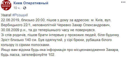 В полиции эту информацию пока не подтвердили. Его родные сообщили, что мальчик ушел брать интервью у прохожих возле дома. Так ранее писали в Телеграм-канале "Киев.Оперативный". "Его рост – около 140 см. Был одет в серые брюки и белую с серыми полосками рубашку", – уточнили в соцсети.