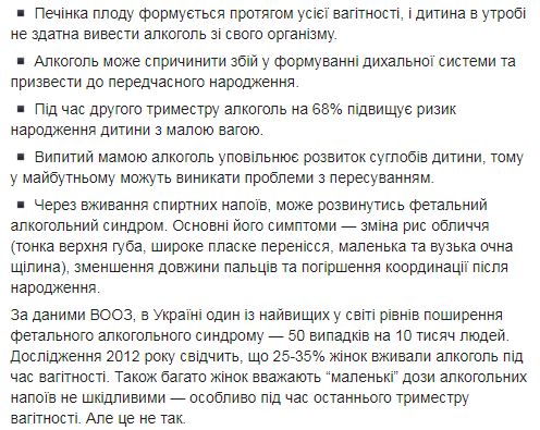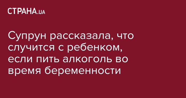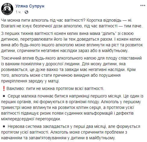 И.о. министра здравоохранения Ульяна Супрун заявила, что беременным женщинам противопоказан алкоголь даже в маленьких дозах, поскольку это может повлиять на развитие ребенка. Об этом она сообщила на своей странице в Facebook 24 июня.