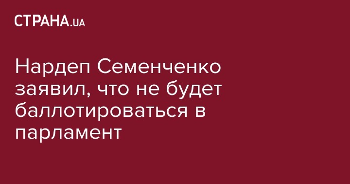 Народный депутат Семен Семенченко сообщил, что не будет баллотироваться в Верховную Раду во время внеочередных выборов. Вместо этого он намерен сосредоточиться на создании новой политсилы единомышленников, помощи ветеранам войны на Донбассе и на "проектах военной сферы".