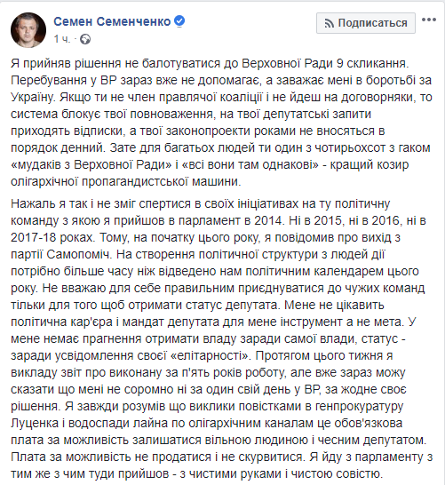 "Я принял решение не баллотироваться в Верховную Раду 9 созыва. Пребывание в Раде сейчас уже не помогает, а мешает мне в борьбе за Украину. Если ты не член правящей коалиции и не идешь на договорняки, то система блокирует твои полномочия, на твои депутатские запросы приходят отписки, а твои законопроекты годами не вносятся в повестку дня. Зато для многих людей ты один из четырехсот с лишним "мудаков из Верховной Рады" и "все они там одинаковые" - лучший козырь олигархической пропагандистской машины", - написал он на своей странице в соцсеи Фейсбук в понедельник.