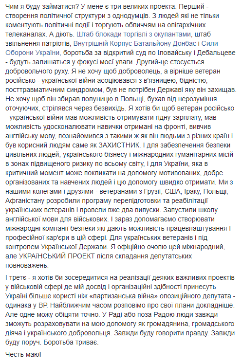 "И третье – я хотел бы сосредоточиться на реализации некоторых важных проектов в военной сфере, где мой опыт и организаторские способности принесут Украине больше пользы чем "партизанская война" оппозиционного депутата-одиночки в Раде. В ближайшее время расскажем о своих планах подробнее", - пообещал парламентарий.