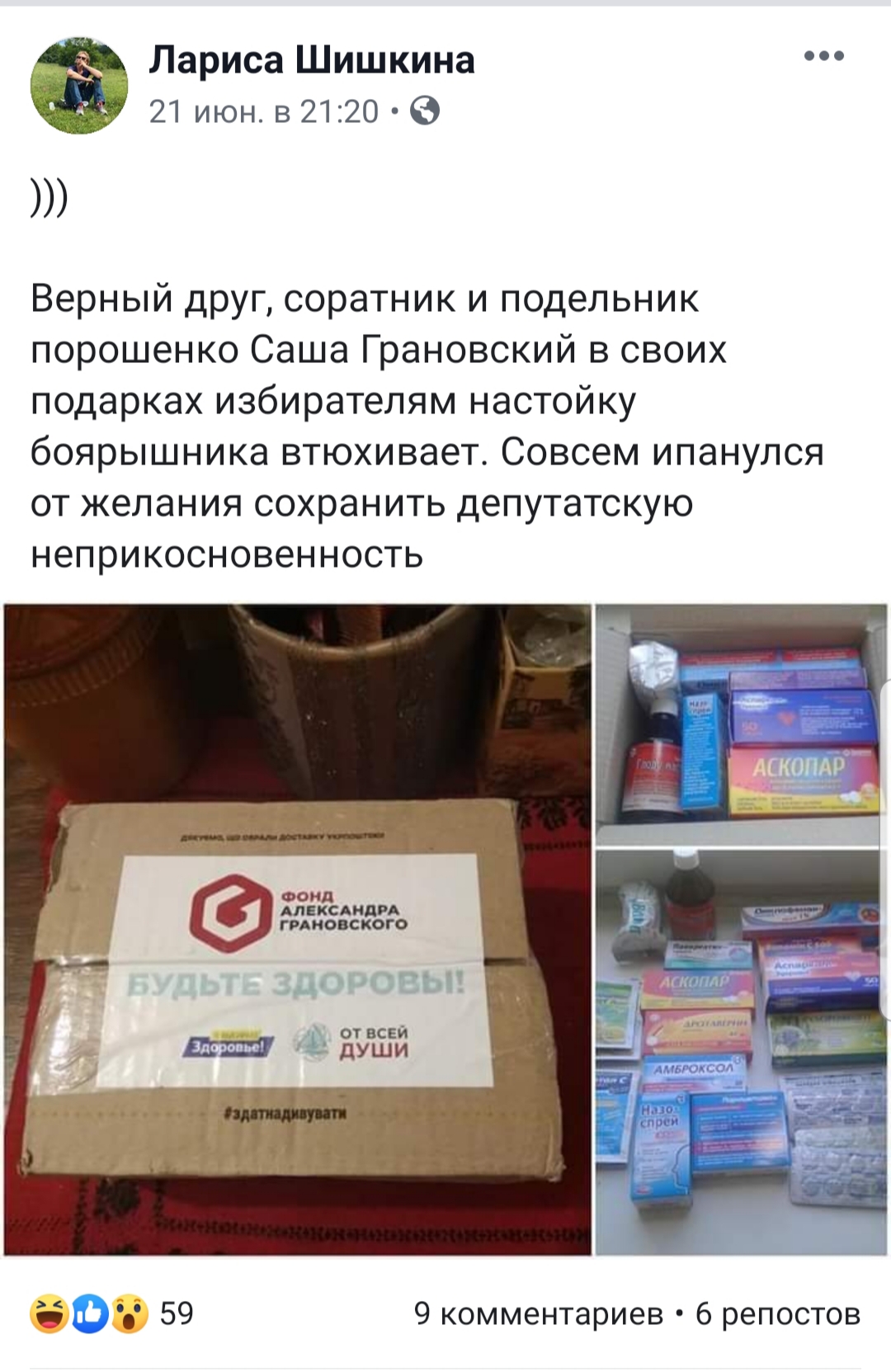 "Верный друг, соратник и подельник Порошенко - Саша Грановский в своих подарках избирателям настойку баярышника втюхивает. Совсем ипанулся от желания сохранить депутатскую неприкосновенность", - пишет жительница Харькова Лариса Шишкина.