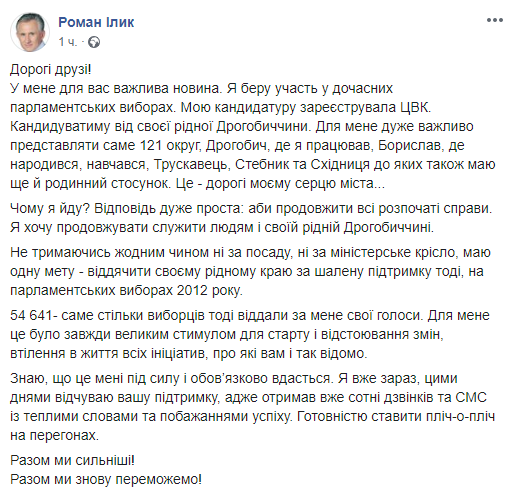 "Я участвую в досрочных парламентских выборах. Мою кандидатуру зарегистрировала ЦИК. Для меня очень важно представлять именно 121-й округ, Дрогобыч, где я работал, Борислав, где родился, учился, Трускавец, Стебник и Сходницу, к которым также имеется семейное положение",- написал в соцсети Илык.