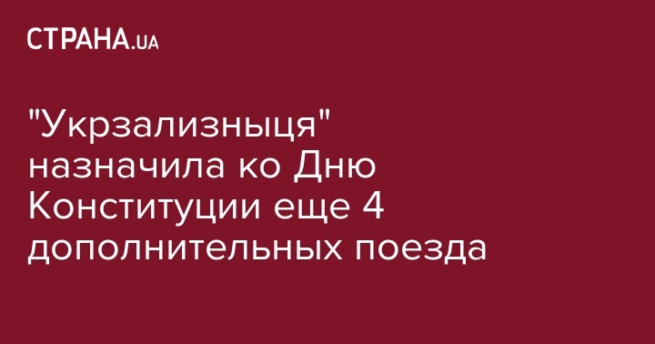 "Укрзализныця" назначила на летний период еще четыре дополнительных поезда, которые будут курсировать на День Конституции Украины, увеличив количество дополнительных поездов до 34. Об этом сообщает пресс-служба компании.