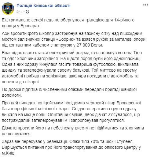 В Броварах при попытке сделать экстримальное селфи 14-летнего парня ударило током в 27 тыс. вольт. Его успели доставить в реанимацию. Об этом сообщает отдел коммуникации полиции Киевской области.