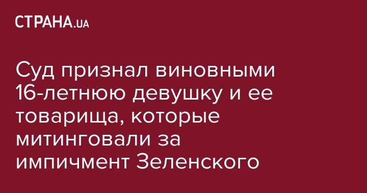 Ровенский городской суд признал виновной в административном нарушении 16-летнюю Дарью Коцюруба, которая 25 мая в центре Ровно с товарищем держали плакаты, на одном из которых была надпись "импичмент президенту". Об этом говорится в сообщении UA Ровно.