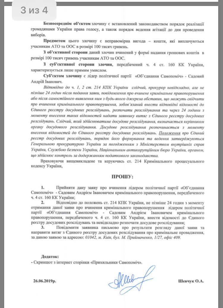 Шевчук требует принять заявление о преступлении Садового по четвертому пункту стати 160 (подкуп избирателя). В качестве доказательства адвокат приводит рекламу группе "Прихильники Самопомочі" в Facebook.
