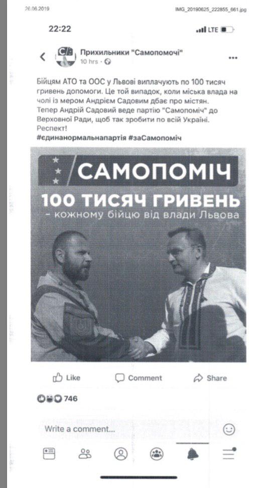 "Бойцам АТО и ООС во Львове выплачивают по 100 тысяч гривен помощи. Это тот случай, когда городская власть во главе с мэром Андреем Садовым заботится о горожанах. Теперь Андрей Садовой ведет партию "Самопомощь" в Верховную Раду, чтобы так сделать по всей Украине", - говорится в посте, иллюстрацией к которому служит фото, на котором мэр Львова жмет руку человеку в форме цвета хаки.