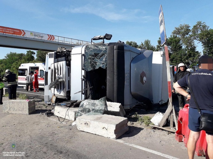 На трассе Киев-Одесса иномарка BMW X3 врезалась в грузовик Renault Magnum 480, в результате чего фура перевернулась и заблокировала движение. К счастью, авария обошлась без жертв. Об этом 26 июня сообщает патрульная полиция Киевской области.