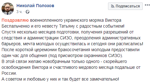 В российском СИЗО женился захваченный в Керченском проливе украинский моряк Виктор Беспальченко. Об этом говорится на фб-странице адвоката Николая Полозова в среду, 26 июня.