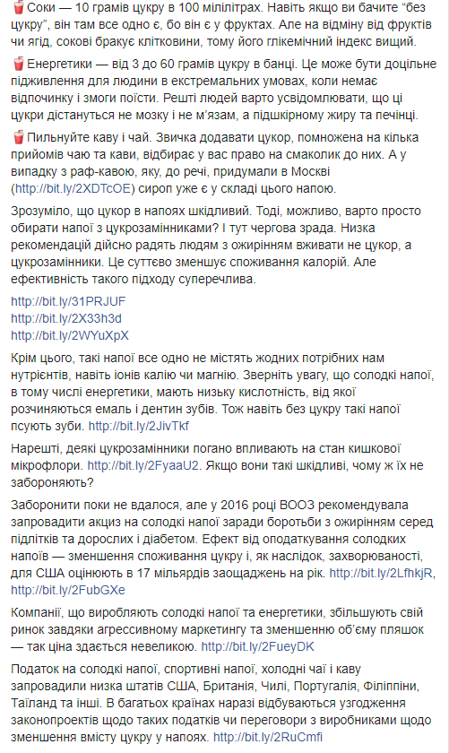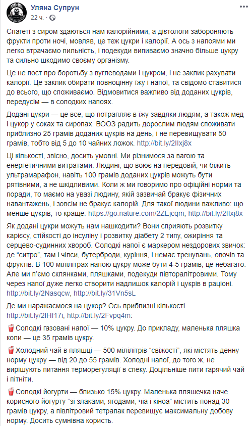 Также она написала, что сладкие газированные напитки содержат 10% сахара (например, маленькая бутылка колы - это 35 граммов), холодный чай содержит дневную норму - от 20 до 55 граммов, сладкие йогурты - около 15% сахара. По ее словам, маленькая бутылочка йогурта содержит его более 30 граммов, а поллитровый тетрапак превышает максимальную суточную норму. В соках - 10 граммов сахара в 100 миллилитрах, в энергетиках - от 3 до 60 граммов в банке. Супрун добавила, что следует следить за сахаром и в кофе и чае.