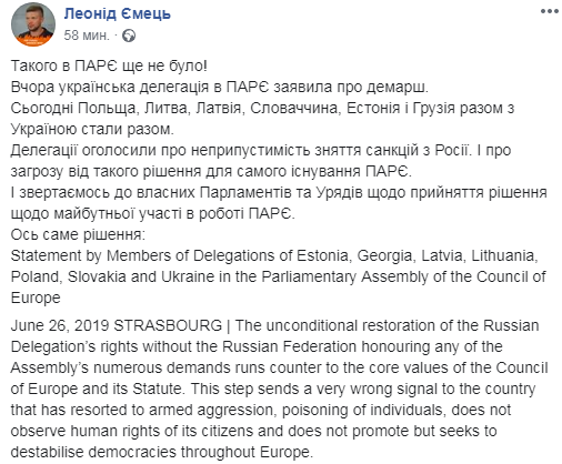 "Вчера украинская делегация в ПАСЕ заявила о демарше. Сегодня Польша, Литва, Словакия, Эстония и Грузия вместе с Украиной стали вместе. Делегации объявили о недопустимости снятия санкций с России. И об угрозе от такого решения для самого существования ПАСЕ. И обращаемся к собственным парламентам и правительствам касательно принятию решения относительно будущего участия в работе ПАСЕ", - говорится на фб-странице украинского нардепа, члена делегации Верховной Рады в ПАСЕ Леонида Емеца вечером в среду, 26 июня.