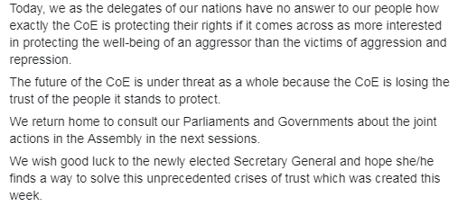 "Сегодня мы, как делегаты наших стран, не имеем ответов перед нашими людьми, как именно Совет Европы защищает их права, если он проявляет большую заинтересованность в защите благосостояния агрессора, чем жертв агрессии и репрессий. Будущее СЕ в целом находится под угрозой, потому что СЕ теряет доверие людей, которых он защищает. Мы возвращаемся домой, чтобы проконсультироваться с нашими парламентами и правительствами о совместных действиях в Ассамблее на следующих сессиях", - говорится в приведенном украинским парламентарием тексте заявления.