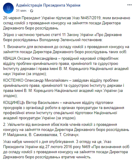 Президент назначил новых членов комиссии: Александра Костенко и Оксану Квашу (заведующего отделом и ведущую научную сотрудницу отдела проблем уголовного права, криминологии и судоустройства Института государства и права им. Корецкого Национальной академии наук), Виктора Кошинца (начальника отдела подготовки прокуроров по организации работы в органах прокуратуры и преподавания профессиональной этики Института специальной подготовки Национальной академии прокуратуры).