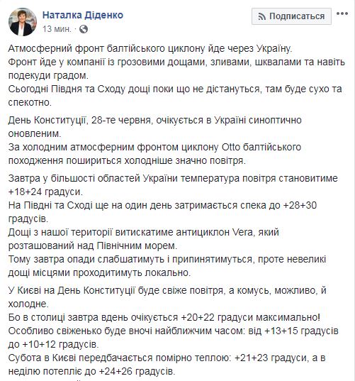 "День Конституции, 28-е июня, ожидается в Украине синоптично обновленным. За холодным атмосферным фронтом циклона Ottо балтийского происхождения распространится значительно более холодный воздух", - пишет она.