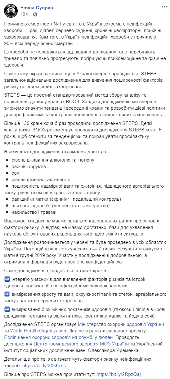 "STEPS - это простой стандартизированный метод сбора, анализа и сравнения данных в странах ВОЗ. Благодаря исследованию мы впервые сможем изучить тенденции внутри страны и разработать действенные политики для профилактики и контроля распространения неинфекционных заболеваний", - добавляет Супрун.