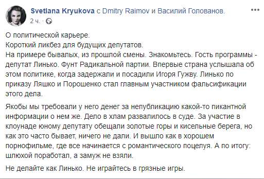 Якобы мы требовали у него денег за непубликацию какой-то пикантной информации о нем же. Дело в хлам развалилось в суде. За участие в клоунаде юному депутату обещали золотые горы и кисельные берега, но как это часто бывает, ничего не дали. И вышло как в хорошем порнофильме, где все начинается с романтического поцелуя. А по итогу: шлюхой поработал, а замуж не взяли.  Не делайте как Линько. Не играйтесь в грязные игры", - написала Крюкова.