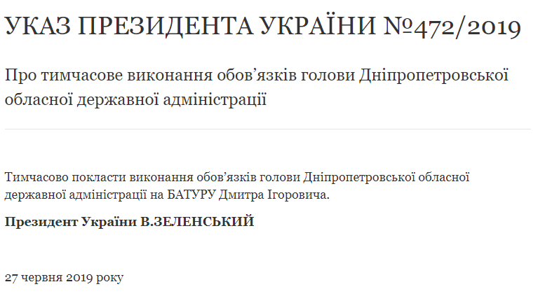 Глава Украины Владимир Зеленский уволил с должности Владимира Резниченко от должности главы Днепропетровской областной государственной администрации (ОГА) и назначил временно исполняющим обязанности главы Днепропетровской областной государственной администрации Дмитрия Батуру.