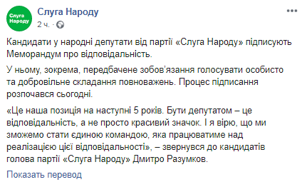 Кандидаты в депутаты от партии "Слуга народа" подписывают меморандум, содержащий пункты об обязательном личном голосовании и добровольном сложении полномочий. Об этом сообщает пресс-служба политсилы в Facebook.