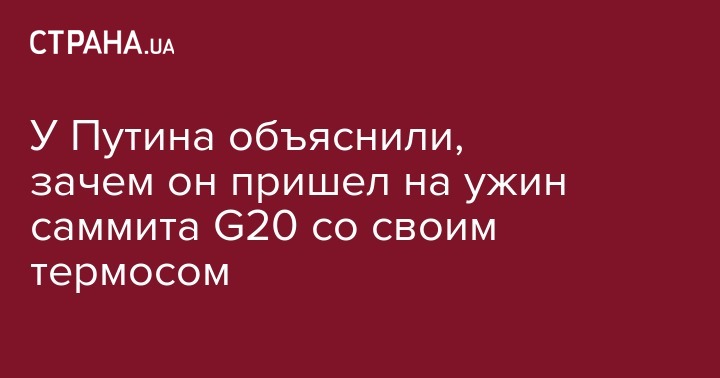 Президент России Владимир Путин на ужин саммита G20 в Осаке пришел со своей термокружкой. По словам его пресс-секретаря, в ней был чай.